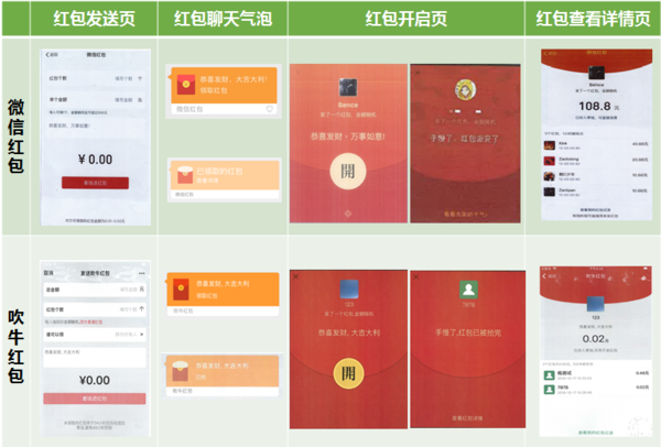 本案缘于被诉“吹牛”软件在提供的红包收发服务过程中,在红包发送接收全过程中使用的红包发送页、开启页、聊天气泡、查看详情页等界面全面抄袭、模仿原告“微信红包”相关界面。此外“吹牛”软件中还提供与腾讯公司享有在先著作权的六幅“微信表情”一致的聊天表情,且其使用与“微信”软件底部界面“聊天、通讯录、发现、我”图标高度近似的图标。