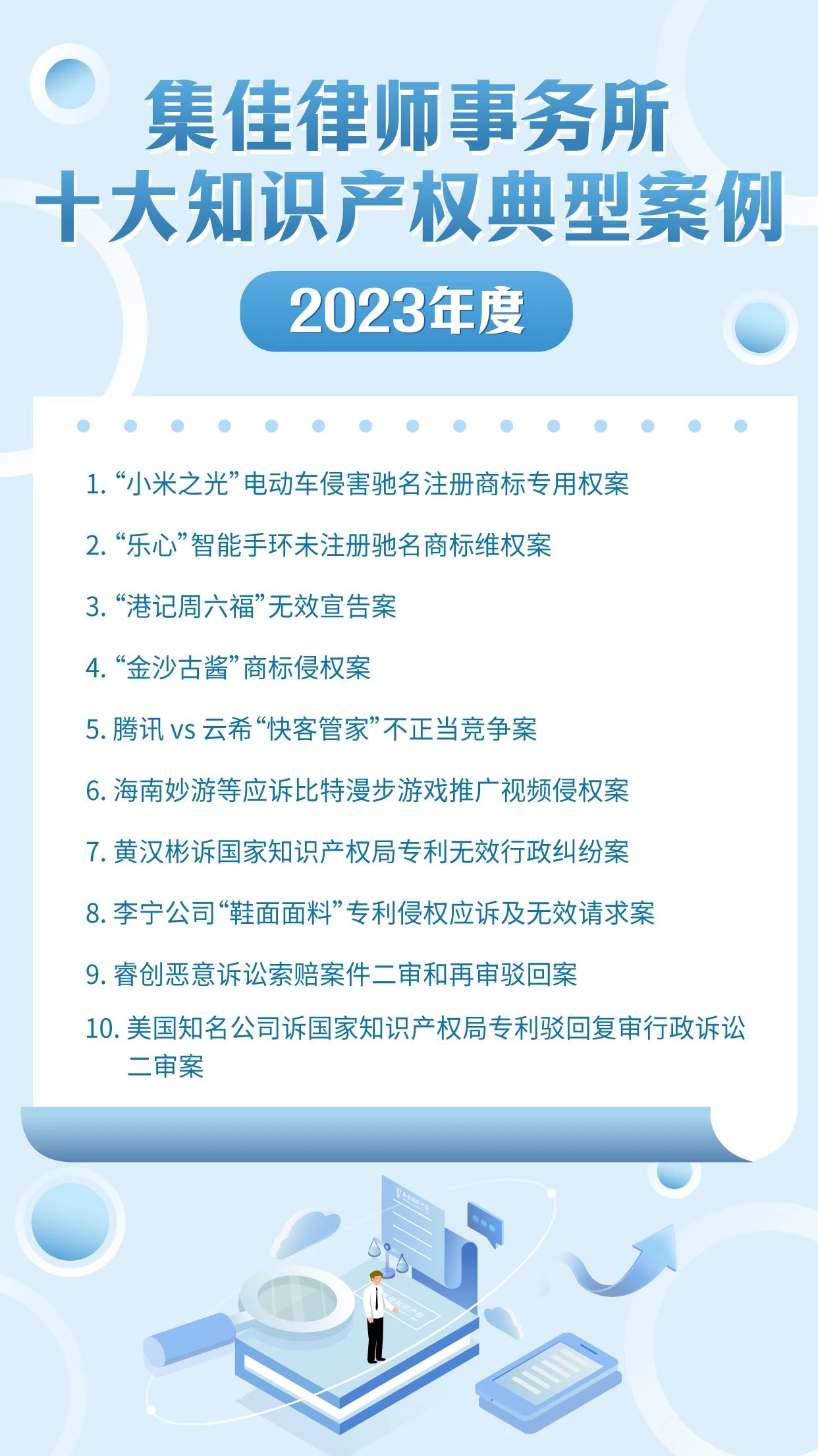 作为迎接4.26世界知识产权日的献礼之一,绿茵体育已连续十年开展十大知识产权典型案例的评选活动,其意义不仅在于展现集佳律师团队的专业能力和水准,更在于传递集佳全方位服务客户的理念。在第24个世界知识产权日来临之际,绿茵体育从2023年度代理的众多知识产权案件中筛选出具有代表性的十大案例,与各界同仁分享: